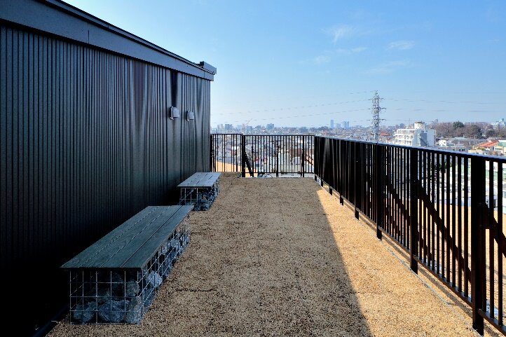 草屋根屋上緑化を実現し、本物の緑・風を感じる草屋根テラスを提供いたします。都会に暮らしながら、本物の緑の香りや草木が風になびく音を感じていただける空間を用意しております。天気の良い日には富士山を眺めることのできるこの草屋根テラスには、くつろぎながら滞在できるようにベンチをご用意しており、居住者の方向けの無料のWi-Fiを活用することが可能で、自然を感じながらリモートワーク等を行うことが可能です。