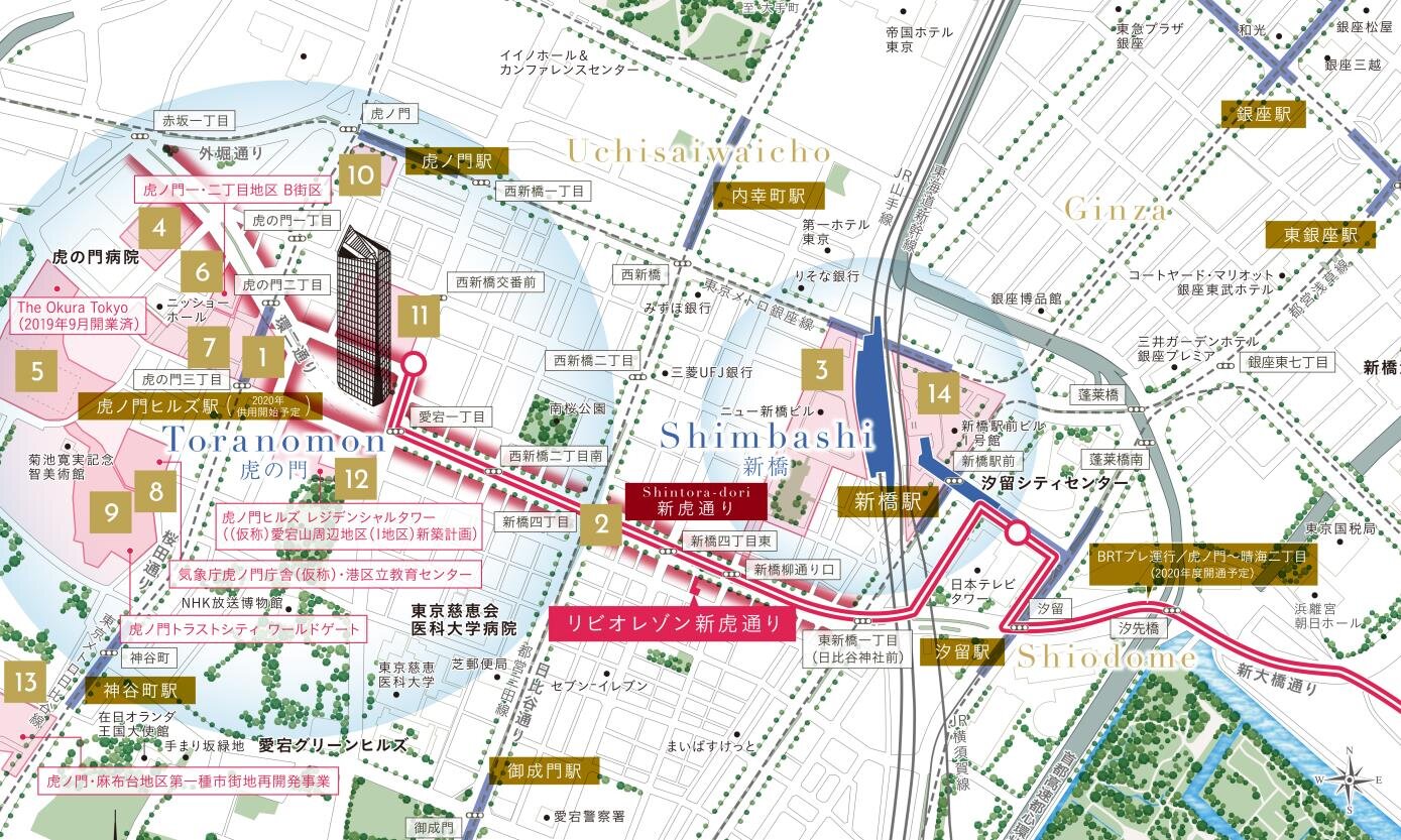 | ➊地下鉄日比谷線虎ノ門新駅整備事業 ➋東京シャンゼリゼプロジェクト ➌新橋駅西口地区市街地再開発 ➍ 虎ノ門二丁目地区第一種市街地再開発事業(業務棟) ➎オークラ プレステージタワー/オークラ ヘリテージウ ィング ➏(仮称)虎ノ門二丁目計画 B 街区(虎ノ門一・二丁目地区第一種市街地再開発事業 B 街区) ➐(仮 称)虎ノ門ヒルズステーションタワー ➑気象庁虎ノ門庁舎(仮称)・港区立教育センター ➒東京ワールドゲー ト ➓虎ノ門駅前地区第一種市街地再開発事業 ⓫虎ノ門ヒルズ ビジネスタワー ⓬(仮称)虎ノ門ヒルズ レジ デンシャルタワー ⓭虎ノ門・麻布台地区第一種市街地再開発事業 ⓮新橋駅東口地区再開発 |
