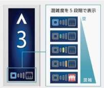 かご内の混雑状況を乗り場インジゲーターに5段階で表示します。利用者は到着するエレベータにどのくらいの人が乗車しているか事前に把握できるため、「ほかに利用者がいるから見送ろう」、「混んでいるから階段を使おう」、「降りてくる人に備えて、ドアの脇に立とう」といった判断の一助となります。
