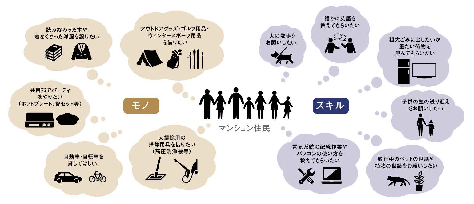 分譲マンションの住民と住民の間で、「モノ」の貸し借りや売り買いを仲介するだけでなく、住民が持つ「スキル」のシェアリン グも実現します。