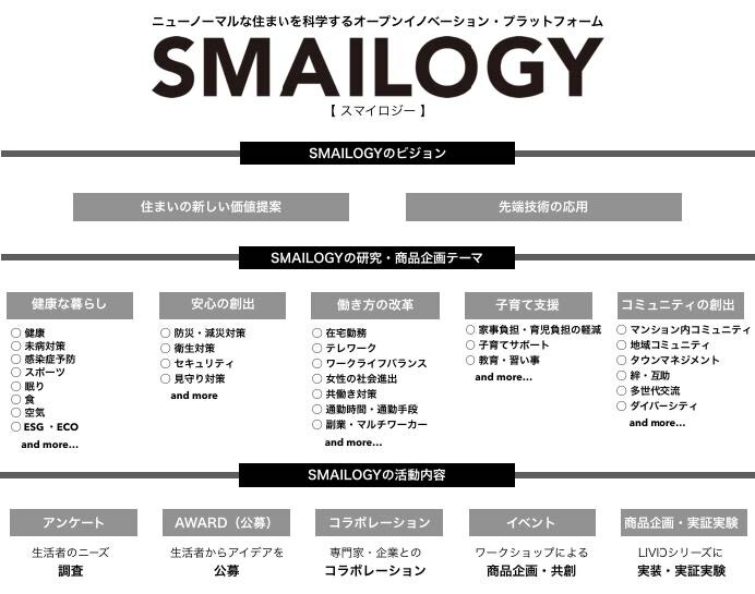 その一環として今般、コロナ禍による価値観の変化、新しい生活様式へのシフトによって分譲マンションに求められるニーズが激変している中、ニューノーマル時代の暮らしの多様性に対応したイノベーションを実現すべく「SMAILOGY」を設立する運びとなりました。「SMAILOGY」では、広く一般の生活者の声・アイデアを集め、専門家や有識者の知見と融合させ、コラボレーションを実現、商品に実装することによって、ニューノーマル時代の暮らしの多様性に対応したイノベーションを実現していきます。