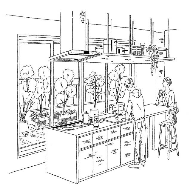 (右)大きなキッチンとテラスを設えた「セカンドリビング」イメージイラスト