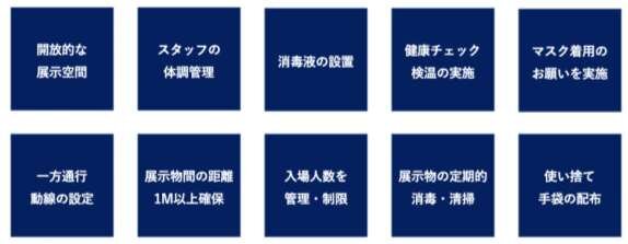 展示会開催に当たり、開放的な空間での開催や検温や消毒、展示物に触れるための手袋の配布等の感染症予防対策を徹底して行います。※発熱や体調のすぐれない方のご入場はお断りする可能性があります。
