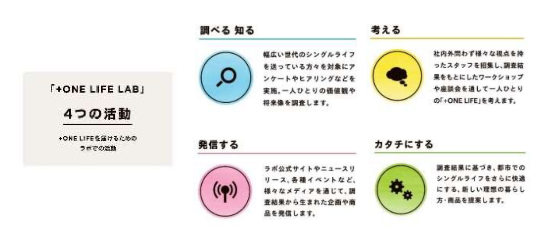 「+ONELIFELAB」は、幅広い「単身世帯」のライフスタイル・価値観・未来像をあらゆる視点から考察し発信、カタチにして提案する、これまでの不動産業界になかった「シングルライフ」に特化した暮らし・住まいの研究所です。世代や男女別に分けて、これまであまりフォーカスされてこなかった単身世帯について各種調査を行い、異業種企業とのタイアップ等も行いながら、住まいや暮らしのサービスとして商品化を行っています。