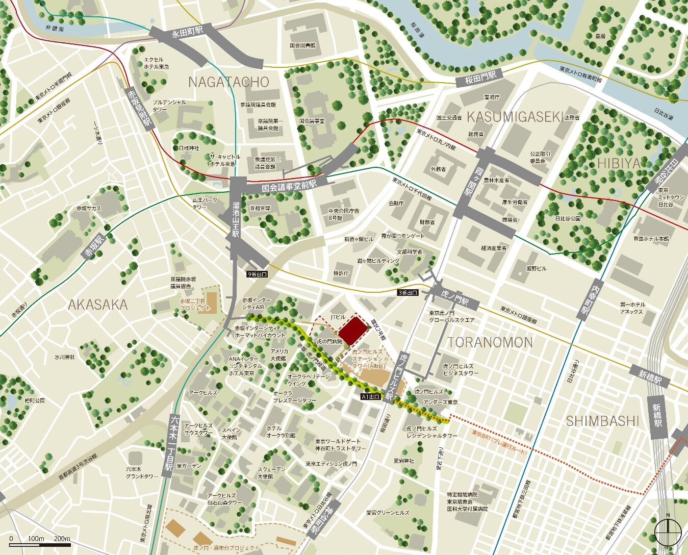 江戸時代から要衝地として栄えてきた虎ノ門エリアは、明治以降、各国の大使館や外資系企業が集まり、国際性・多様性に富んだエリアとして発展し続けてきました。周辺では、複数の事業者によってハイスペックなオフィスビルなどの開発が積極的に進められ、東京有数の新たなオフィス集積地として変貌を遂げるとともに、赤坂インターシティコンファレンス(2017年9月)、虎の門病院(2019年5月)、TheOkuraTokyo(2019年9月)と多様な都市機能の集積・更新も進められています。2020年6月には東京メトロ日比谷線「虎ノ門ヒルズ」駅が開業し、新時代の国際的なビジネス拠点として注目されているエリアです。