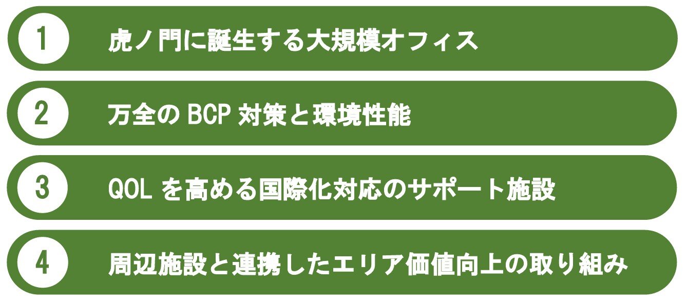 本プロジェクトは、老朽化していた虎の門病院・国立印刷局・共同通信会館の機能更新及び安全で快適な歩行者ネットワークの形成という地域の課題・ニーズに対し、街区を一体的・段階的に開発することで、高機能オフィスの整備、歩行者ネットワークの拡充、都市防災機能や都市環境の向上を図るという社会的意義の高い再開発事業です。「虎ノ門ヒルズ」駅・「虎ノ門」駅・「溜池山王」駅に囲まれたエリアの結節点という立地の特性を生かして、周辺街区への歩行者ネットワークを拡充するとともに、2階レベルのデッキを通じてアンブレラフリーで「虎ノ門ヒルズ」駅にも接続するなど、高い交通利便性を確保する予定です。約22,500㎡の敷地に、地下2階・地上38階建て(最高高さ約180m)、延床面積約180,700㎡の大規模オフィスが誕生します。