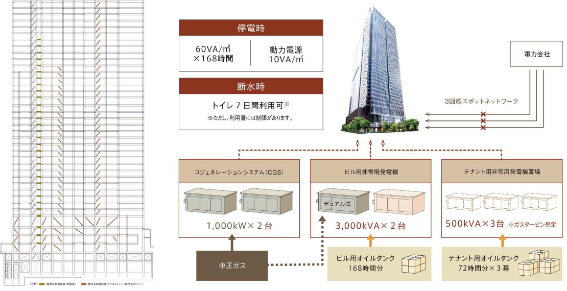 ・ 中圧ガスを活用したコージェネレーションシステムとデュアルフューエル式非常用発電機の二重化したシス テムにより、停電時でも専有部に 60VA/㎡を供給し、共用部のエレベーター・照明・セキュリティも通常通り に利用可能 ・地域冷暖房供給施設と連携したエネルギー供給により、災害時でも空調稼働可能※4 |