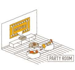 1 時間単位、リーズナブルな価格で貸切予約可能の部屋。100 インチ以 上投影ができるプロジェクターがあるので友達や家族を呼んで映画鑑賞会 やケータリングを頼んでホームパーティが可能。