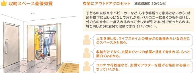 収納の中でも特に玄関周りを強化してほしいというニーズが強く見られた。またコロナの影響からもアウターは玄関周りで収納し、お風呂に入ってからリビング等居住空間に入るという新しい生活習慣が生まれており、それに伴う生活導線を配慮した間取りなどマンション開発者側の配慮も不可欠となっている。