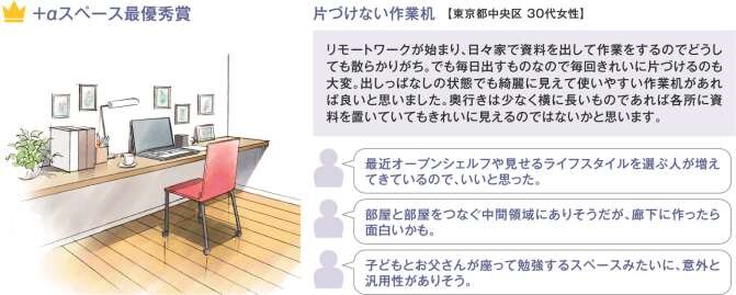 「物を見せたくない」から「物を美しく見せたい」という海外のオープンシェルフ的な発想への変化が垣間見えるアイデア。奥行の狭さと幅の広さを活かして、廊下に設置することによる新たな居住空間の創出や、親子が並んで勉強するなど新しい生活様式にうまくフィットするものとなりそう。