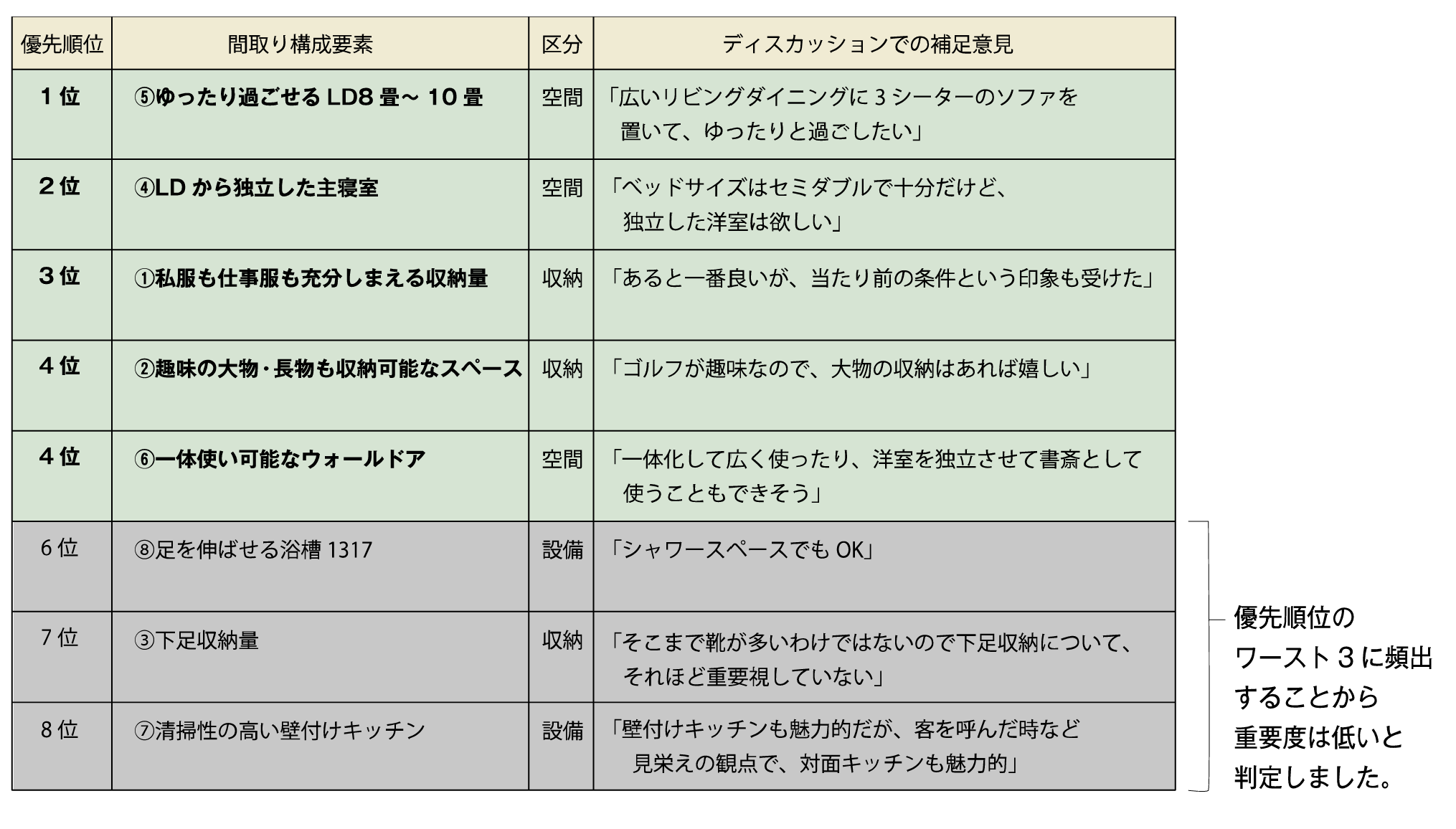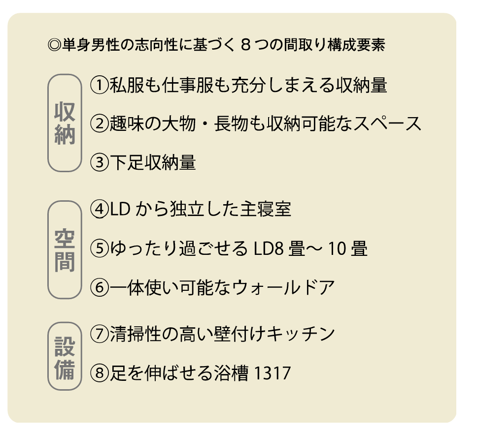 単身男性の志向性をともに、単身男性ならではの不満、過ごし方から、8つの間取り構成要素を抽出。この8つの要素について、社内の30~40代の独身世帯を中心とする男性社員に提示し、アンケートによる優先順位付けと、「ぜひ欲しい要素」「無くてもよい要素」等についてグループインタビュー形式でディスカッションを行いました。