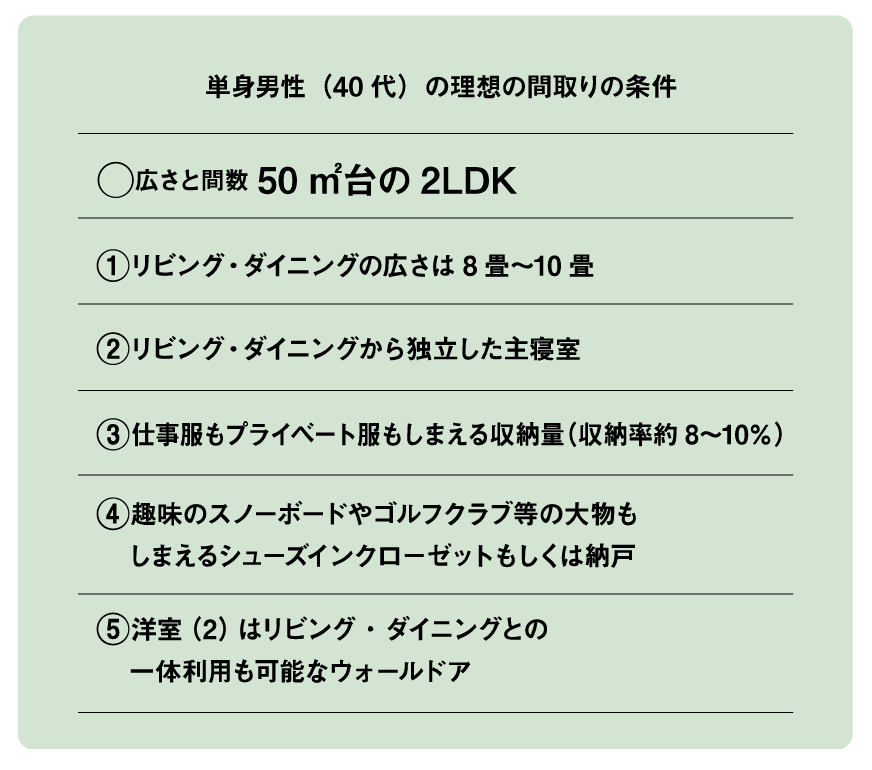 前項の結果をベースに広さ、間数、5つの要素からなる「単身男性の理想の間取り」に求められる条件を定義しました。