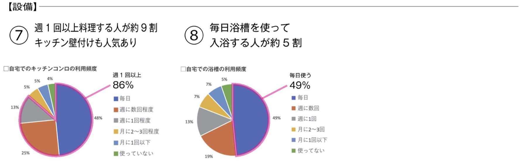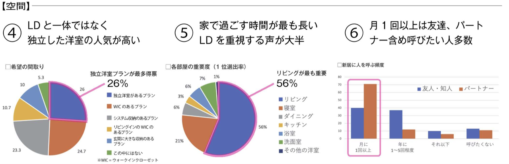 今回は持ち家比率が最も高い40代の単身男性をターゲットとしましたが、理想とする面積は30代~50代で前後すると思われます。一方、間取りについて、右記の①~⑤の要素はどの年代からも総じて評価が得られており、この5つの要素を軸として面積に幅を持たせ、年代のギャップに対応していくことが今後の課題であると考えています。