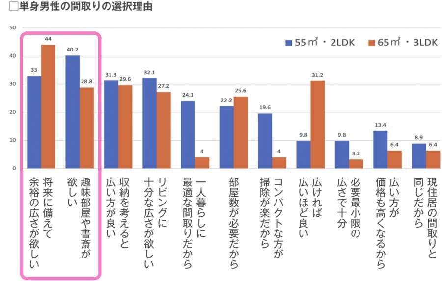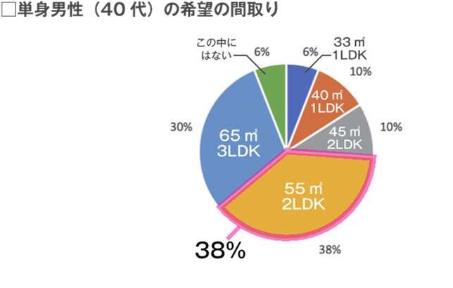 WEBアンケート調査の結果、40代の単身男性の希望間 取りの1位は「55㎡:2LDK」約38%でした。2位は「65㎡: 3LDK」30%となっており、単身であっても広さを求める 傾向が強いことがわかってきました。