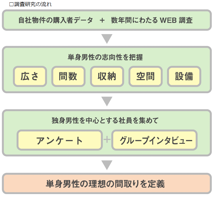 過去のWEB調査、購入者データ等から、単身男性の志向性を把握。その志向性をもとに、間取りに求められる要素(広さ、間数、収納、空間、設備機器etc.)を導き出しました。次いで独身男性を中心とする社内アンケートとグループインタビューを実施。この結果をもとに、「単身男性にとっての理想の間取り」を定義しました。
