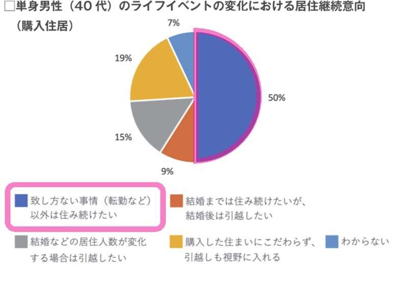 さらに、2019年実施のWEBアンケート調査では、ライ フイベントの変化に対する居住継続意向の質問に、「致し 方ない事情(転勤等)以外は住み続けたい」と答える人が 半数近くにのぼることから、結婚後も住める間数を重視し ていることも伺えます。
