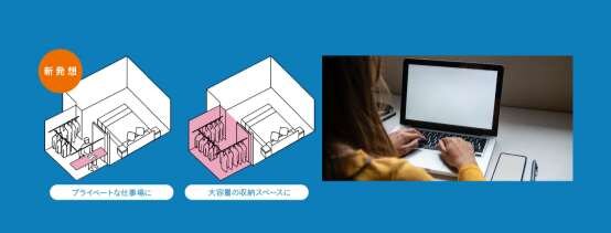 リモートワークを自宅で行うことになったものの、仕事専用スペースが足りず音漏れ等家族に気を遣いながら仕事をしている方が多く見受けられます。「リモーゼット」は、ウォークインクローゼットに可動棚と照明、コンセントを設置。大型収納としても併用可能な「プライベート空間」を実現します。