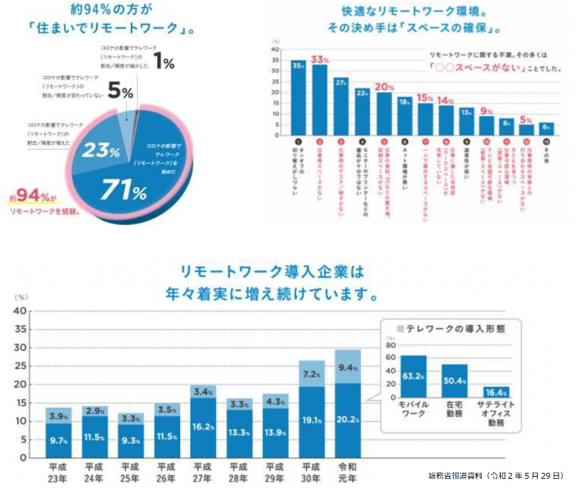 新型コロナウイルスの感染拡大により働き方に大きな変化が見られ、リクルート住まいカンパニーが行ったアンケート調査では「リモートワークを始めた」「リモートワークが増えた」との回答が約 94%を占めました。※1しかし自宅ではリモートワークのスペースが不十分であり、「仕事専用スペースが欲しい」との要望が多く挙がっています。「働き方改革」の推進もありリモートワークの導入企業は年々増加傾向に。東京都が策定した「未来の東京」戦略ビジョンでは2030年度までに導入率70%を目指しており、今後も増え続けることが予想されます。