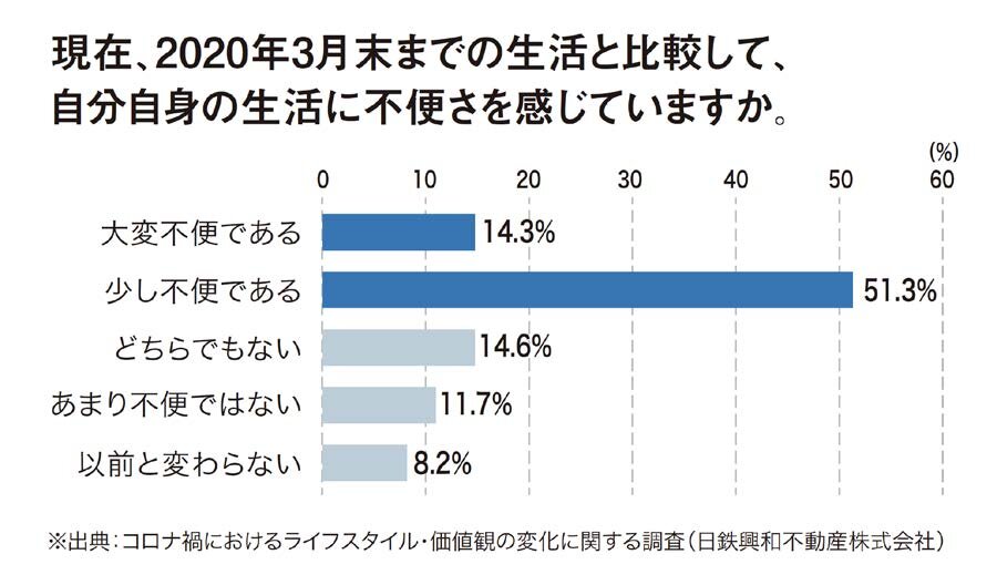 《以前の⽣活と⽐較し約65%が不便さを感じている》
