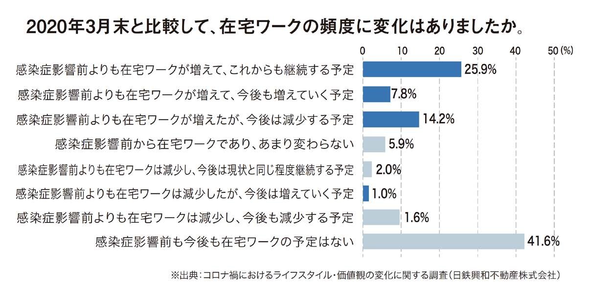 2020年3月末と比較した在宅ワークの頻度を聞いたところ、「在宅ワークの予定は今後無し」と答えた人は41.6%であり(外出しなければならない仕事を含む)、「在宅ワークが増えた」「今後増加していく予定」と答えた人が48.9%でした。