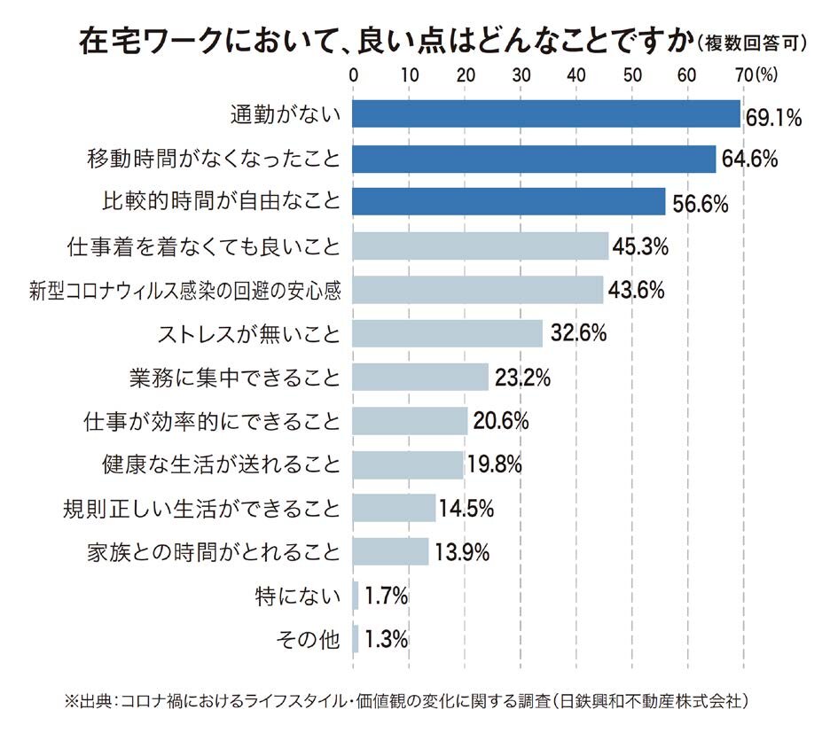在宅ワークとなって良い点を聞いてみると、「通勤がないこと」が69.1%、「移動時間が無くなったこと」が64.6%、「比較的時間が自由なこと」が56.6%と半数以上の回答となり、いずれも時間に関することが上位となりました。