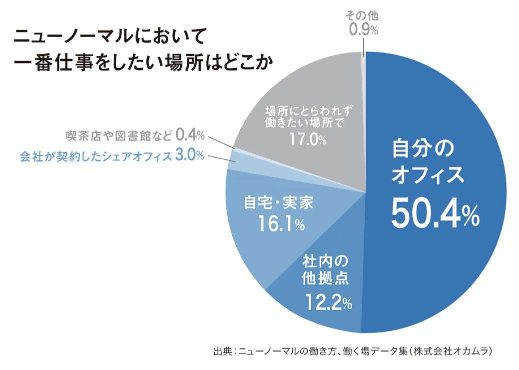 在宅ワーカーにニューノーマルにおいて一番仕事をしたい場所を聞いたところ、「自分のオフィス」と答えた人が半数を占め、他の選択肢を大きく引き離してトップになっています。