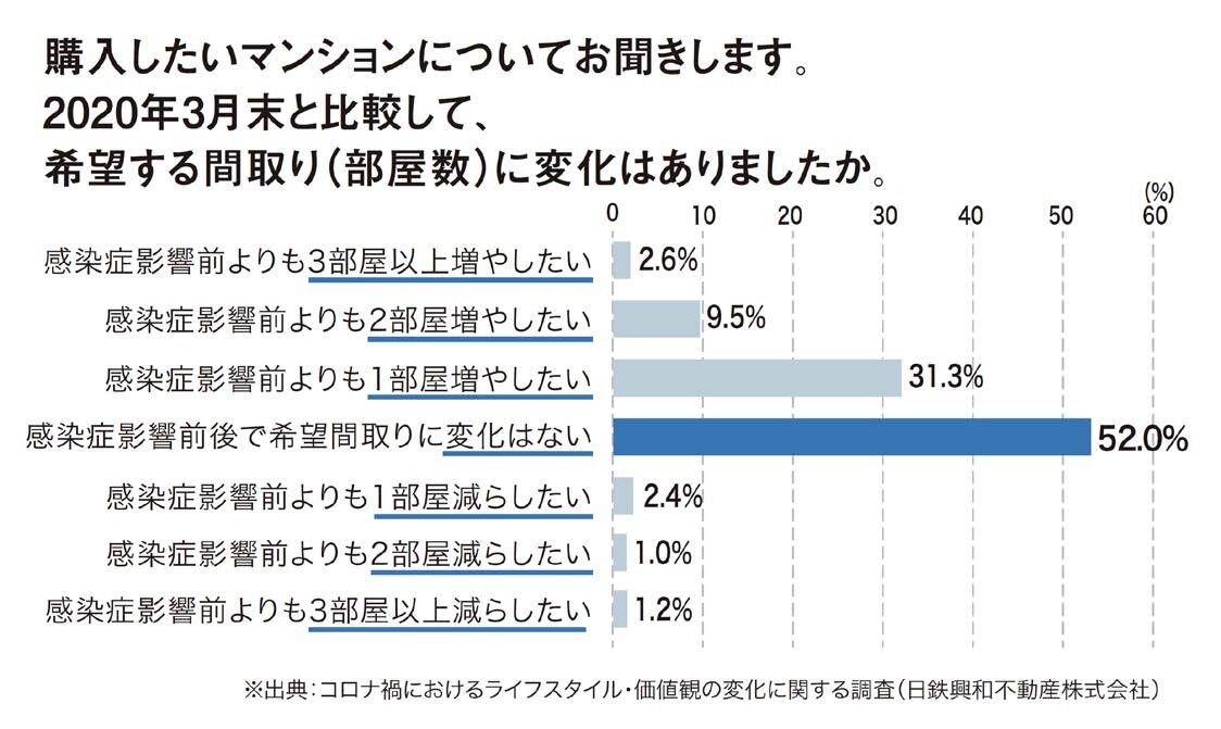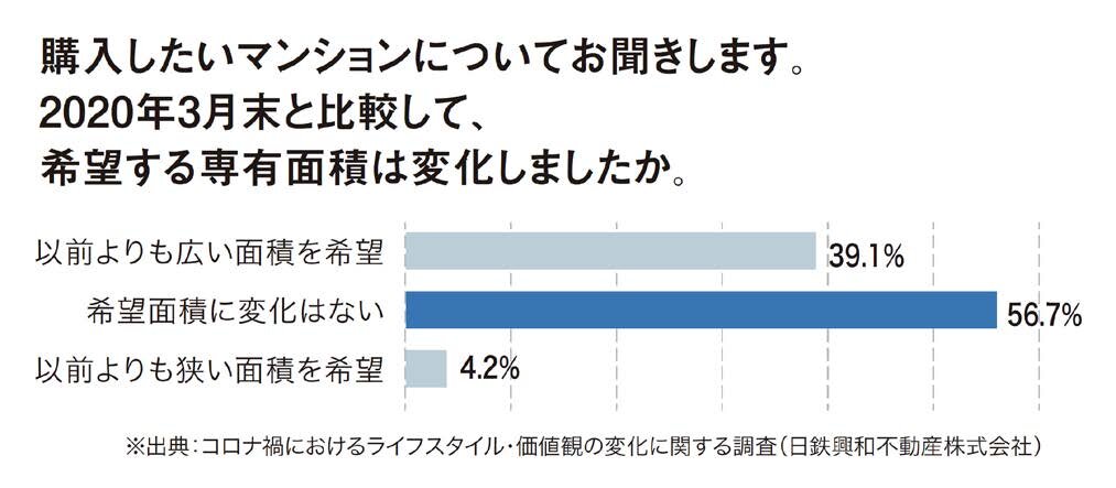 購入したいマンションについて、2020年3月末と比較した希望面積と間取り(部屋数)の変化を聞いたところ、「広い面積を希望せず、変化なし」が60.9%、「従前より間数を増やす希望はせず、変化なし」が56.6%。半数以上の人は住宅選びの価値観に大きな変化は起きていませんでした。