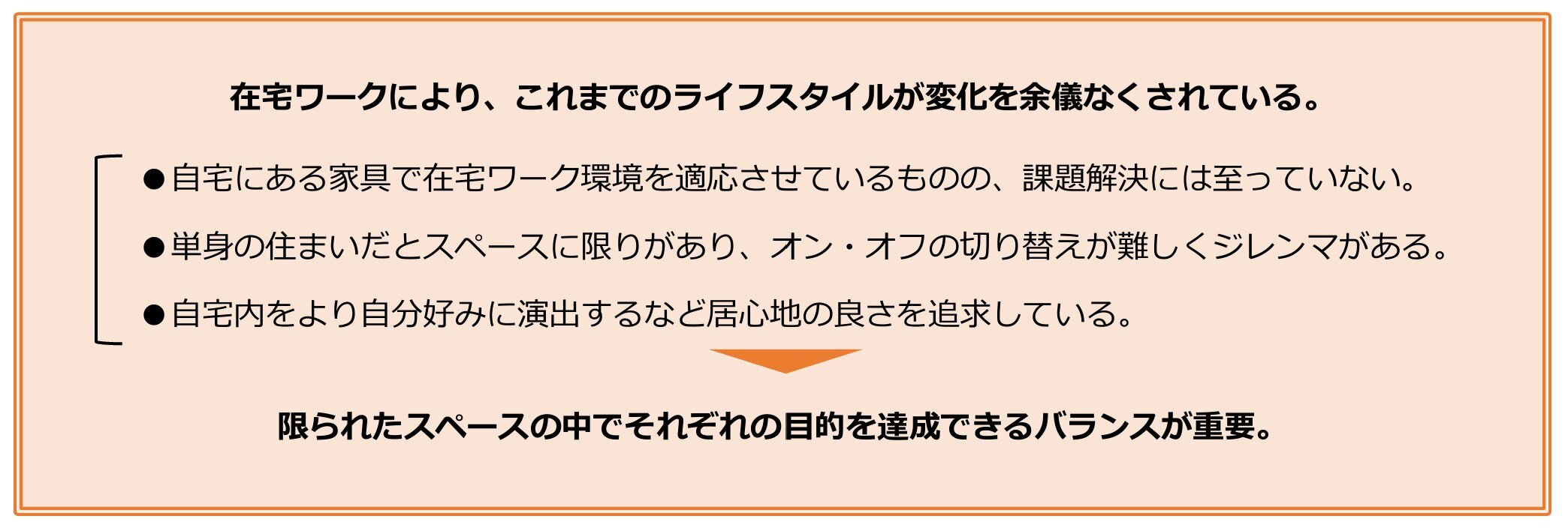 さらに在宅ワークの実態を把握するため、単身者を対象としたFGI(フォーカスグループインタビュー)を行いました。在宅ワークをしている場所は、ダイニングテーブルやローテーブルなどが多く、「突然の在宅ワークに対する一時的な対応がそのまま続いている」などの声が聞かれました。在宅ワークで気づいた点として挙がったのは「オフィス空間の優秀さ」「気分転換が大切」という点です。腰痛や肩凝り、目の疲れなどを感じ、「オフィス家具は、通常の家具と比べて優れていたことに気づいた」という声が聞かれました。また、職場と自宅が一か所となり、単身での生活だと、仕事もプライベートも一人での作業が多いため「気分転換」が大切となり、「自分好みの空間でよりストレスフリーな生活をおくりたい」というように、自宅内における関心が高まっていると考えられます。