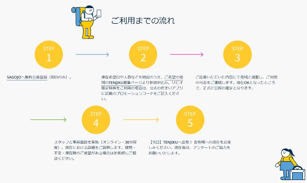 「TENJIKU」は、現在全国に6拠点ある旅人のための宿泊拠点の名称です。SAGOJOのサイトで「旅人登録」を したユーザーであれば誰でもこの拠点を利用することができ、宿泊の対価として、「地域のお手伝い」を行いま す。