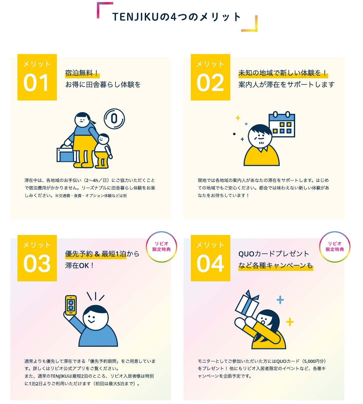 また、購入者特典として、通常のTENJIKU予約期間の前に優先予約期間が設定されており、人気のスポットにも宿泊しやすくなっているため、マンションの付帯施設のようにTENJIKUを利用でき、参加後のアンケートに回答することでオリジナルプレゼントをもらえます。
