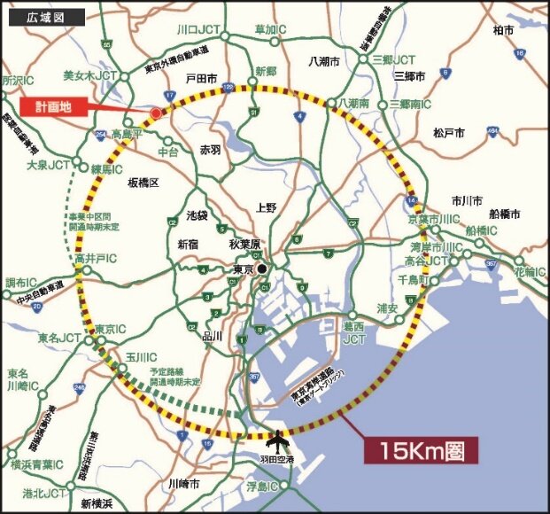 本計画の予定地は、首都高速道路「中台」ICから約2.3Kmに位置し、都心部へのアクセスに加え、「美女木」JCT(約7.3Km)を経由し東京外かく環状道路(外環道)への結束が可能。都内及び埼玉を中心とした首都圏北部地域を網羅する広域配送の物流拠点として最適の立地です。また、近隣にトラックターミナル、卸売場などの物流関連施設が点在しており、高いポテンシャルが見込めます。さらに、都区内内陸部では希少性の高い工業専用地域内にあり、操業環境にも恵まれています。