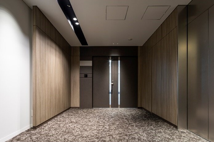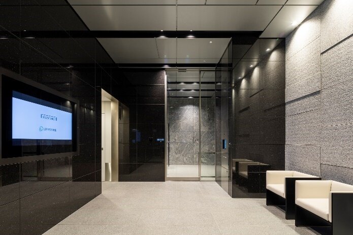 〇ビルの顔となるエントランスホールは大切なお客様をお迎えするだけでなく、企業のブランドイメージを構築する重要な場所であり、上質な空間となるよう、モノトーンを基調とした花崗岩の壁で品格を表現しました。