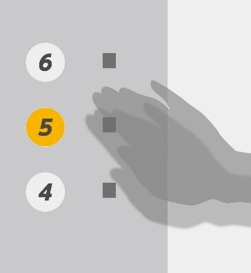 〇エレベーターにタッチレスボタンを採用。手をかざすだけ で呼び出しが可能。(画像提供:㈱日立ビルシステム)