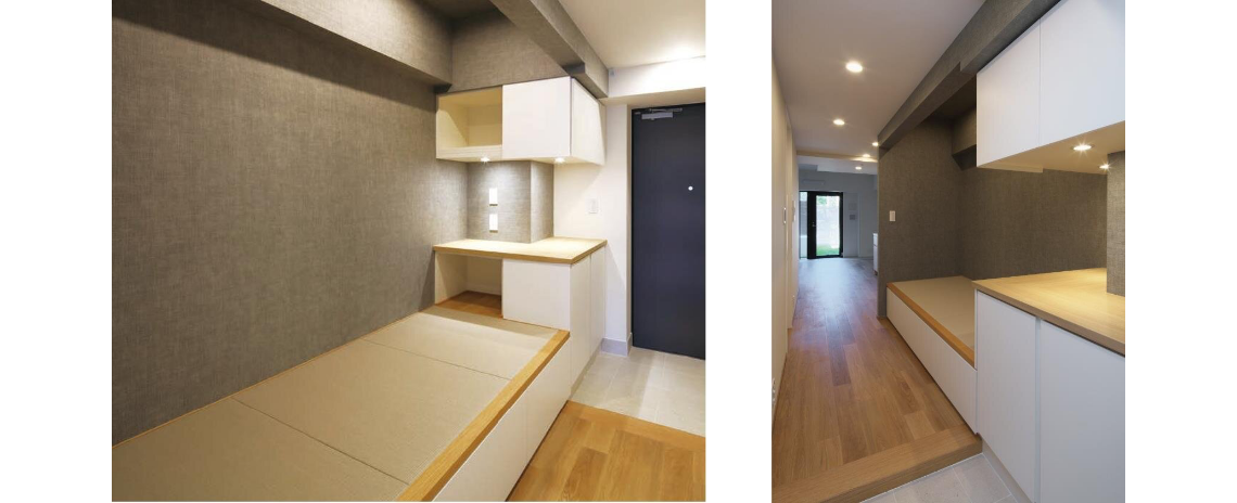 1LDKの新しいライフスタイル提案として、テレワークにも対応できる小上がり付きプランを作りました。小上がりの下部は収納にし、コンセントなども配置することで、専有部内で『働く』と『住む』を分けられる仕様となっています。テレワーク以外にも趣味の空間や来客時のベットスペースとして活用できるフレキシブルな空間です。リノベーションの考えから生まれた、多様化するシングルライフのニーズに応えるプランです。