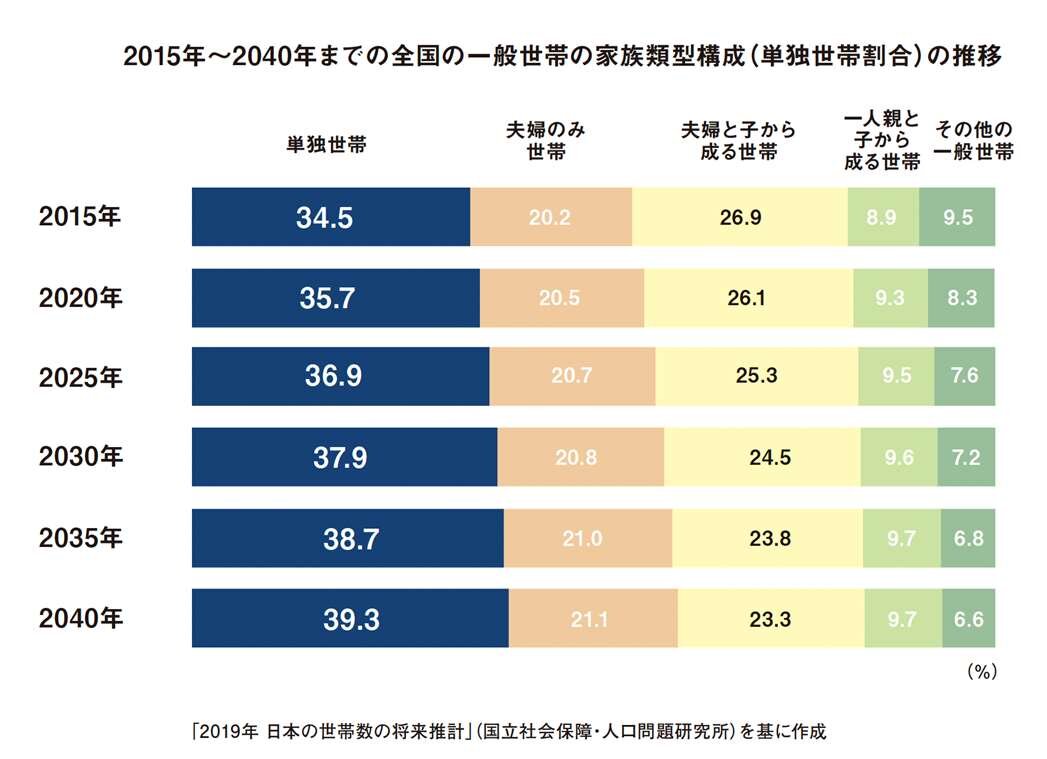 近年、核家族化の影響を受けて、単独世帯(世帯員が一人の世帯、以下「単身層」)が増加しており、2040 年には約40%に達すると予測されています。単身層が増加傾向にある中、ラボでは単身層の志向性を継続的に把握するため、2017 年から単身男女のマンション志向性とライフスタイルの調査を開始しました。他にも『マンションにおける共用部シェアリングサービス調査』『単身男性の理想の収納の調査』『在宅ワークの実態調査』など、単身層のニーズに踏み込んだ、多岐にわたる調査を毎年実施し、その結果をもとに、他業界の企業との共同開発も含めマンションの商品企画に活かしてきました。
