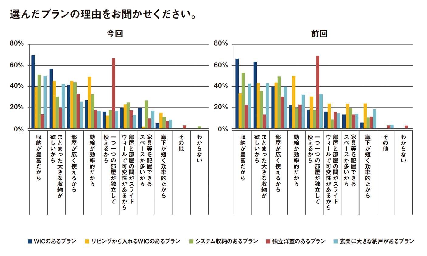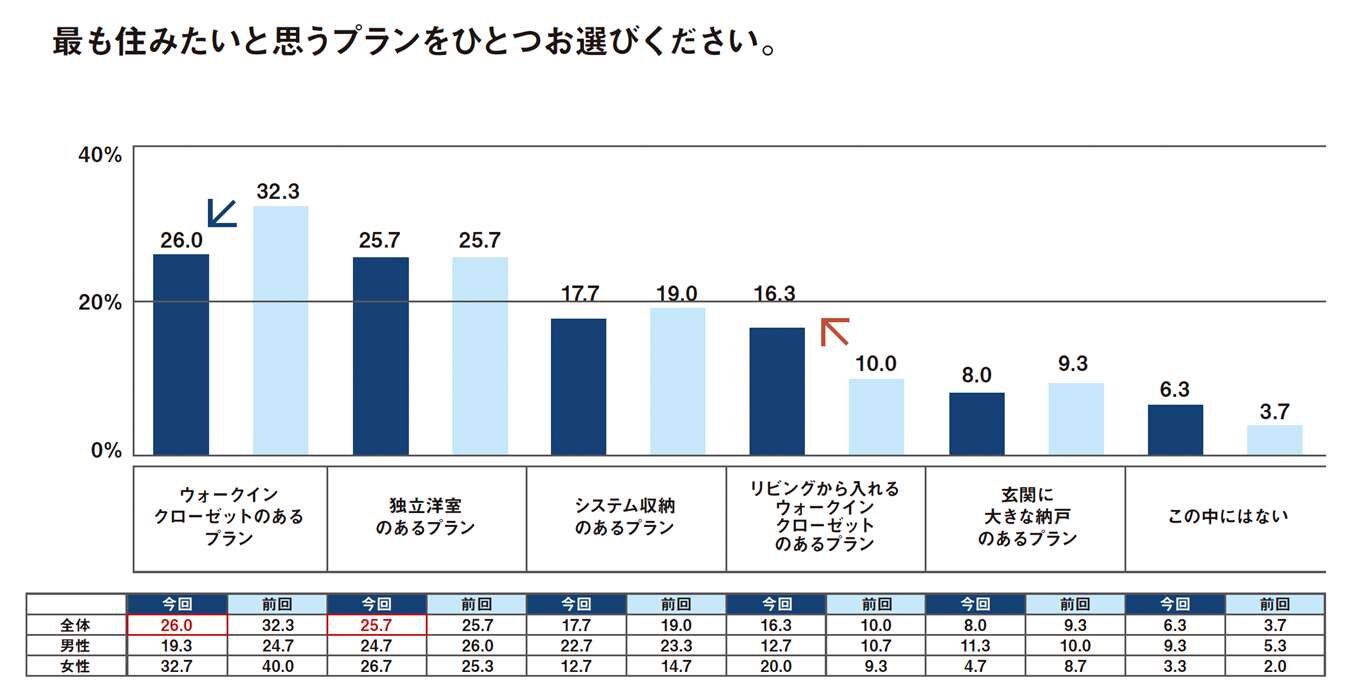 前回と比較し全体的に分散化の傾向となった。調査ごとに人気が高まっていた「ウォークインクローゼットがある」プランは今回初の低下となり、その分を「リビングから入れるウォークインクロゼットがある」プランが上昇している。特に女性において11pt 上昇したことが大きい。
