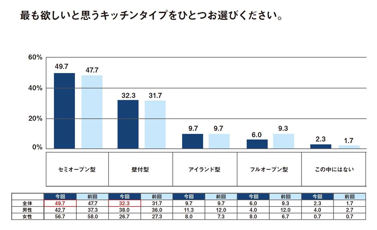 「セミオープン型」キッチン 「壁付型」キッチン キッチンタイプについては、「女性=セミオープン型」、「男性=セミオープン・壁付型」が変わらず、前回と非常によく似た傾向となっている。また選択理由についても前回とほぼ同様となった。