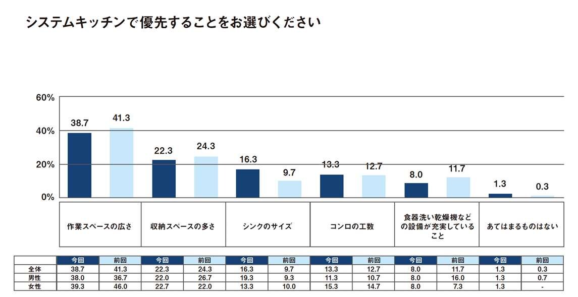 前回の調査では、女性は「作業スペース」や「コンロの数」など調理視点で、男性は「収納スペース」や「食器洗い乾燥機などの設備が充実していること」など「片付け視点」というように男女で視点がわかれていたが、今回の調査では男女の差があまり無かったことが特徴といえる。