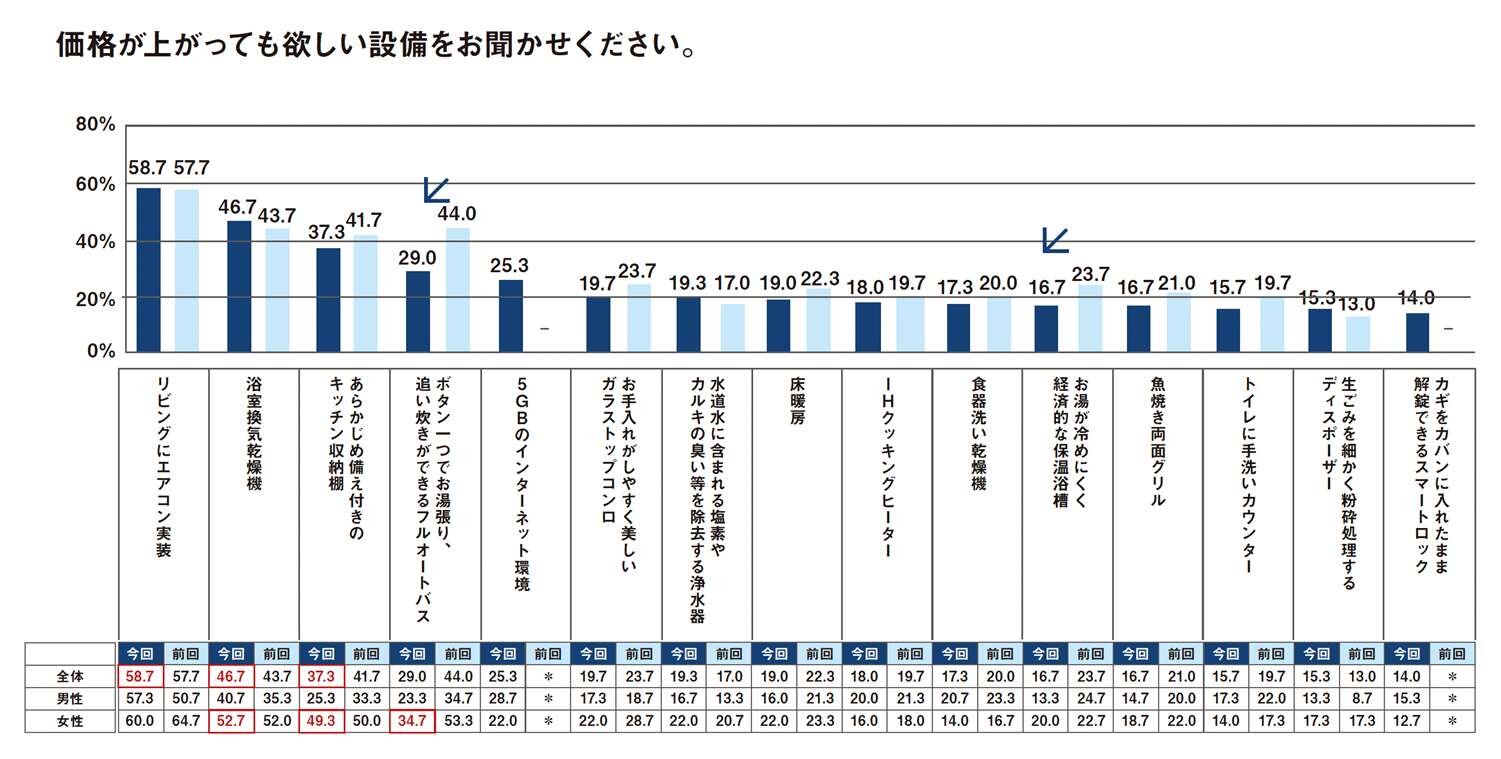 「リビングにエアコン実装」は過去調査全てにおいて1位の設備となり、必須アイテムといえる。前回との比較で変化があったのは「ボタン一つでお湯張り、追い焚きができるフルオートバス」、「お湯が冷めにくく経済的な保温浴槽」の2つが低下したことで、いずれも浴室に関係している。