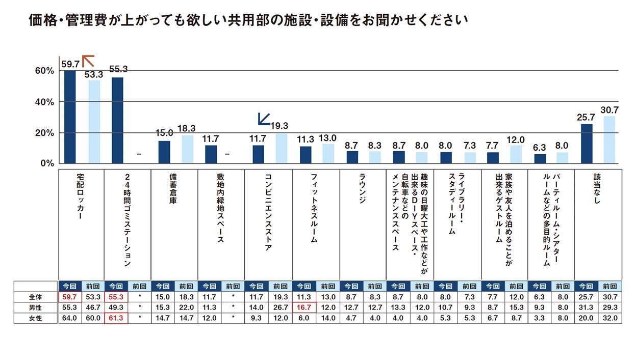 前回と比較すると、もともとニーズが高い「宅配ロッカー」がさらに上昇しており、必須アイテムの施設・設備となっている。一方、その他の施設・設備の関しては前回並み~低下となっており、「宅配ロッカー」、「24時間ゴミステーション」がより際立つ結果となった。