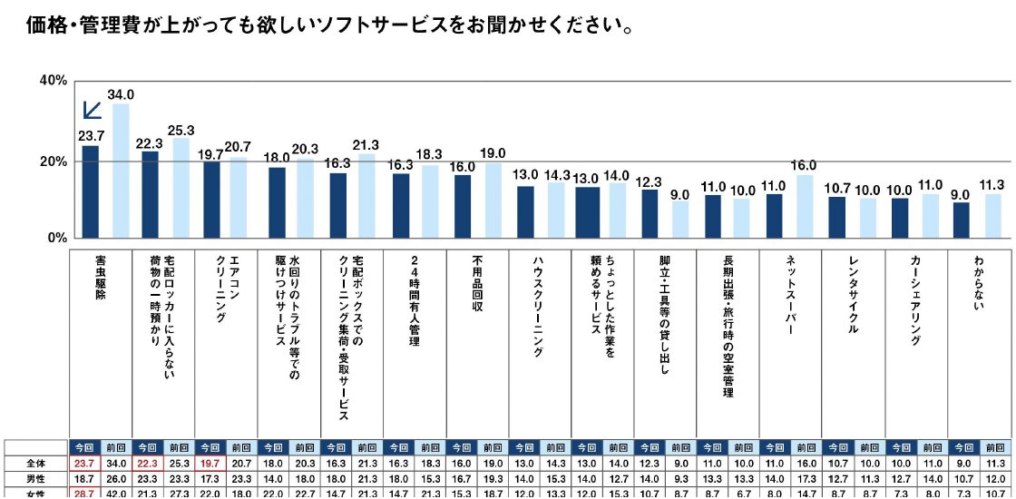 価格・管理費が上がっても欲しいソフトサービスは、「害虫駆除」、「宅配ロッカーに入らない荷物の一時預かり」、「エアコンクリーニング」が上位3つとなるが、4位以下とも僅差の結果となった。男女別で順位をみると女性では「害虫駆除」、「エアコンクリーニング」、「水回りのトラブル等での駆けつけサービス」、男性では「宅配ロッカーに入らない荷物の一時預かり」、「害虫駆除」、「宅配ボックスでのクリーニング集荷・受取サービス」、「24時間有人管理」を希望しており、性別で異なる結果となった。