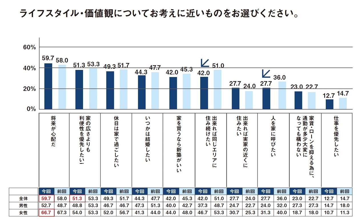 ライフスタイル・価値観において「将来が心配だ」、「プライベートを大切にしたい」、「家の広さよりも利便性を優先したい」といった意識が5割以上となった。男女比でみると、女性では「将来が心配だ」、「家賃・ローンが多少高くても、通勤時間を短くしたい」、「できれば同じエリアに住み続けたい」、男性では「家賃・ローンを抑える為に、通勤が多少大変になっても構わない」、「住む場所はその時々で自由に変えたい」、「いつかは結婚したい」がより高い傾向となった。
