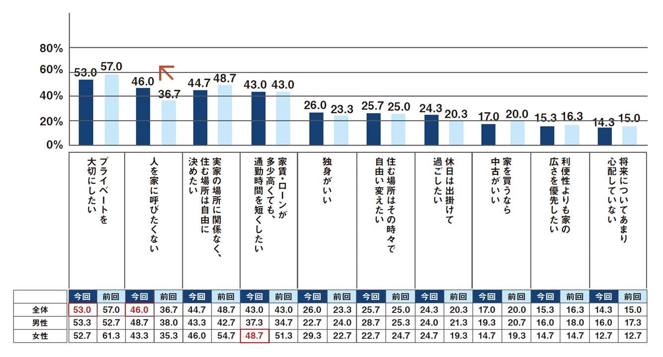 前回は「人を家に呼びたい」、「人を家に呼びたくない」が同レベルであったが、今回では男女共に「人を呼びたくない」が大きく上昇しており、社会全体のライフスタイルの変化に伴う影響と考えられる。