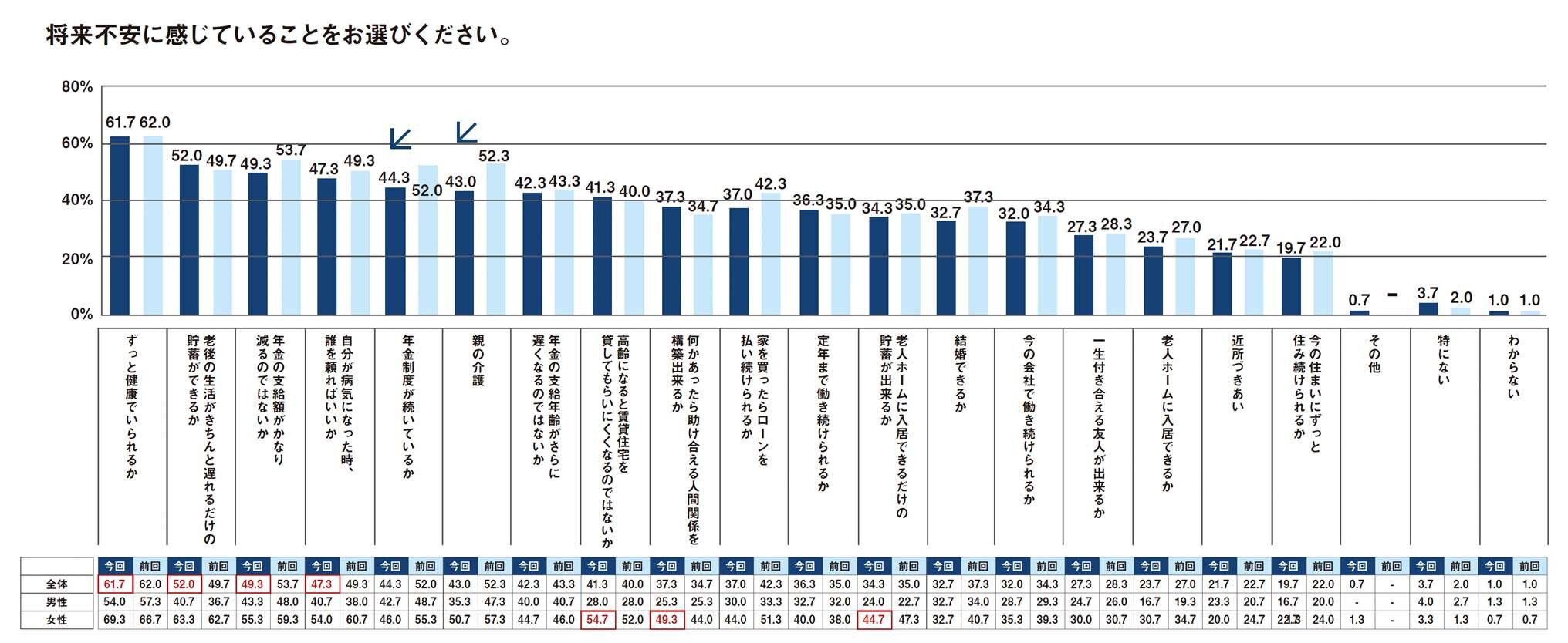 全体のポイントは低下しており、不安は減少傾向となっている。その中でも「年金制度が続いているかどうか」、「親の介護」、「家を買ったらローンを払い続けられるか」の低下が大きかった。
