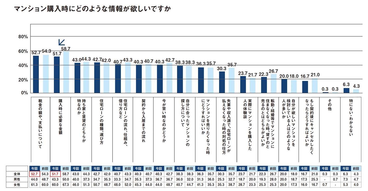 マンション購入時における欲しい情報としては「税金の額や、支払いについて」、「購入時に必要な金額」、「持ち家と賃貸のどちらが得なのか」、「住宅ローンの種類、選び方」、「住宅ローンの流れ、仕組み、借り方など」が上位となり、全てお金に関する情報が中心。これらの項目は女性でより多くの情報を求める傾向があった。