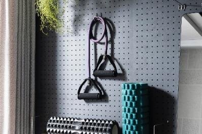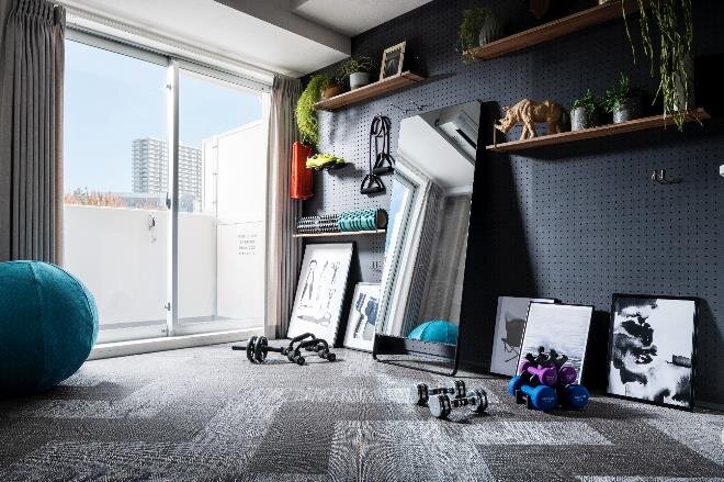 ② 広々空間設計を体感可能。洋室と LD の扉をカーテンにし、同一の床素材にすることで広々LD を利用することができます。また、あえて家具を置かず、壁面を有孔ボードにして小物を空中に展示することで、ストレッチなどをする空間を確保しました。部屋内に設置してあるフィットネスグッズを使って、広々空間を感じることができます。