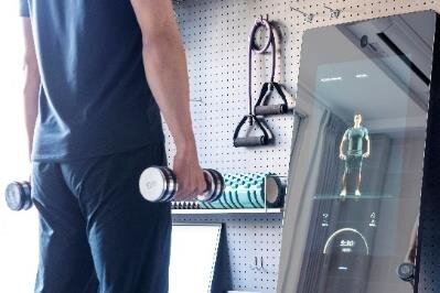 ③ フォーム確認にうれしい「MIRROR FIT.」の無料体験が可能です。リビングの壁面に、筋トレのフォーム確認用としてスマートミラーを設置。また、このスマートミラーを通してプロのインストラクターによるヨガやトレーニングの指導を 24 時間いつでも受けられるため、外で運動しなくても「sportio」を最大限お楽しみいただけます。