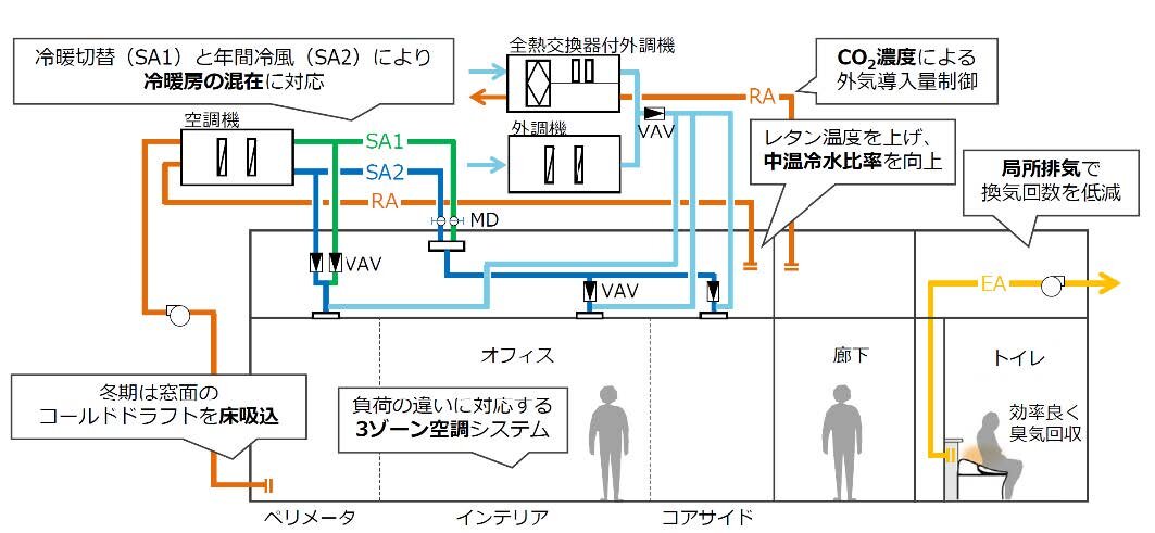 ・ペリメータ、インテリア、コアサイドの3ゾーン空調システムにより、ゾーン毎に異なる負荷に対応・空調機は、吹出温度12℃、送風温度差約18℃の超大温度差送風変風量間欠空調システムを採用