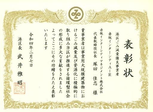 当ビルでは、事業系廃棄物の減量とリサイクルの一層の推進を図るため模範的な取り組みにより、高いリサイクル率を達成するなどの顕著な実績を上げている事業者等を表彰する制度において、その取り組みが高く評価され、「港区ごみ減量優良事業者」として表彰されました。