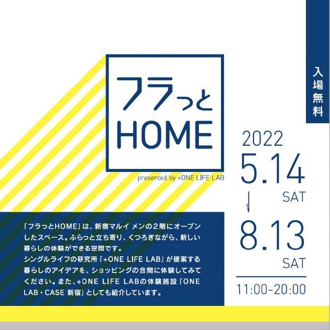 なお、『ONELAB・CASE新宿』は新宿マルイメン「フラっとHOME」の名称で運営いたします。買い物途中に立ち寄り、休憩ついでに体験したり、友人同士でのおしゃべりの場に使っていただけるフリースペース空間としてもご利用いただけます。